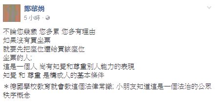 但是德國人不會對於座位的事情吵鬧嗎?鄭華娟表示「通常不會」,若他們遇到有乘客不讓座的狀況時,會先請列車長過來向乘客說明侵占方面的法律責任,如果對方仍置之不理的話,就必須面對法律的相關罰則,但如果是列車長不處理的話,就可以提出告訴。