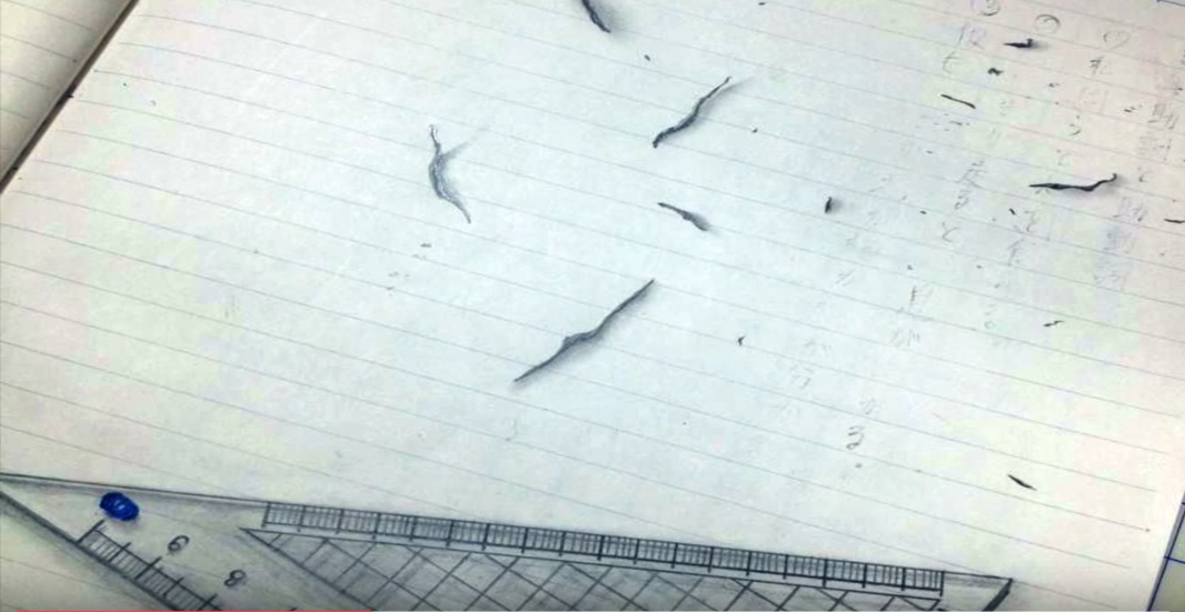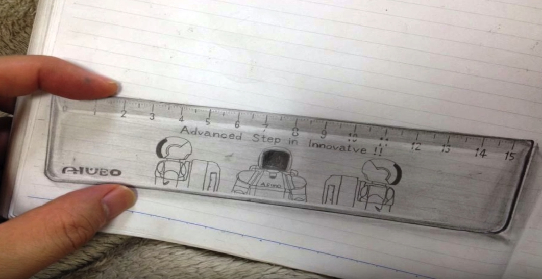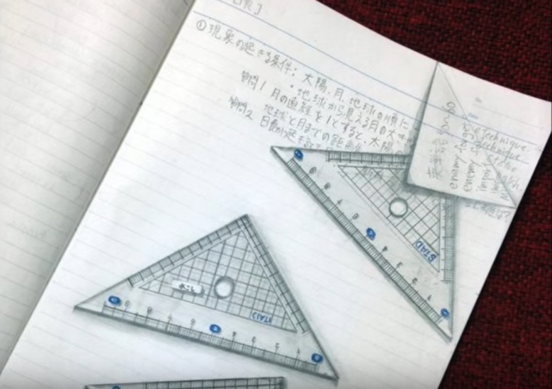 除了製作立體透視模型外,Mozu也會創作錯覺藝術。他使用特別的創作手法,在筆記本上畫出「假的」尺或三角板,透過特別設計的物體陰影和透明感相輔相成,一張以假亂真「拿不起來」的錯覺藝術就完成了。除了文具外,他還有創作其他如橡皮擦屑、筆芯等錯覺藝術,同樣也獲得網友盛讚,直呼「真的是高中生嗎?應該是美術系大學生吧」。