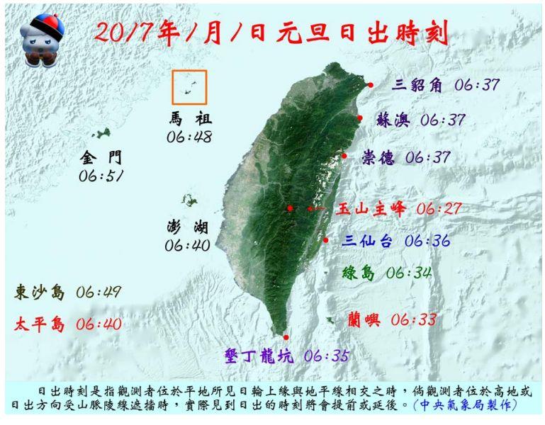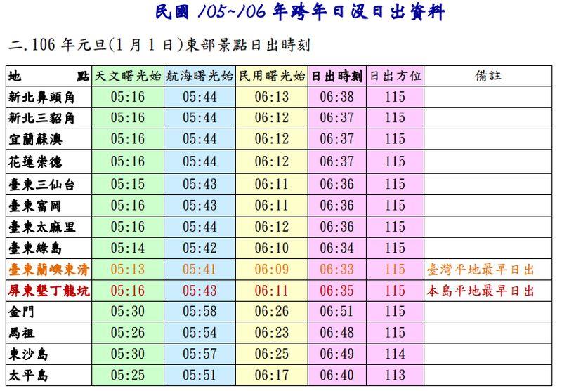 根據中央氣象局14日在網站上公布的跨年「日出時間表」,今年台灣本島最早能看到日出的地方是玉山主峰,時間為清晨6時27分,而平地最早能看到日出地方是在外島蘭嶼東清,時間為清晨6時33分,台灣本島則是屏東墾丁的龍坑,預計清晨6時35分太陽就會升起。