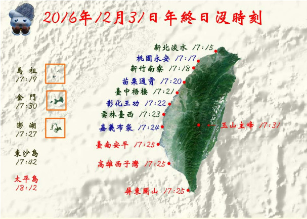 2016年即將進入尾聲,全台有許多地方都在籌備迎曙光、送夕陽等跨年活動,而中央氣象局也整理出了台灣2016年各地日落以及2017年