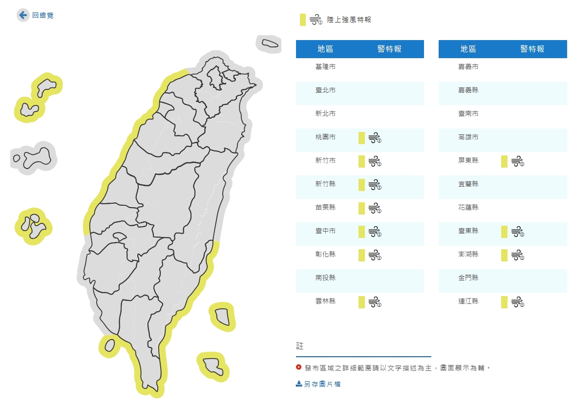 氣象署針對桃園市、新竹市、新竹縣、苗栗縣、台中市、彰化縣、雲林縣、屏東縣、台東縣、澎湖縣、連江縣發布陸上強風特報,提醒桃園至雲林沿海空曠地區及恆春半島、蘭嶼、綠島、澎湖、馬祖有9至10級強陣風,嘉義、台南、東半部沿海空曠地區及基隆北海岸、金門亦有較強陣風,鄰近海域並有較大風浪。