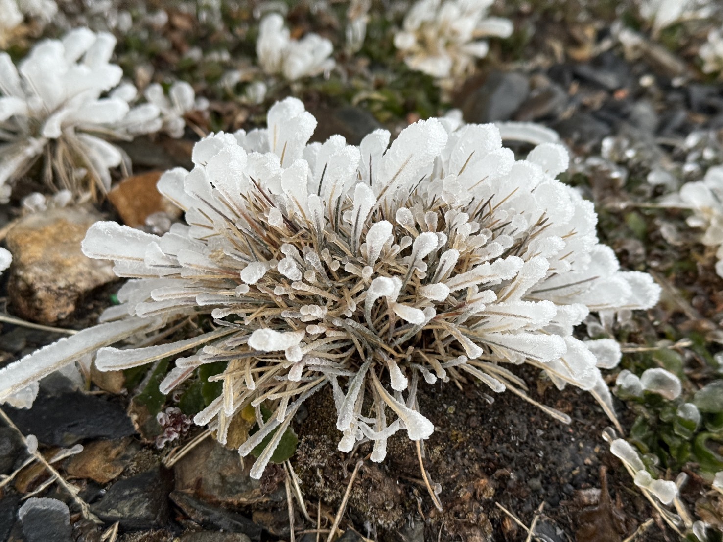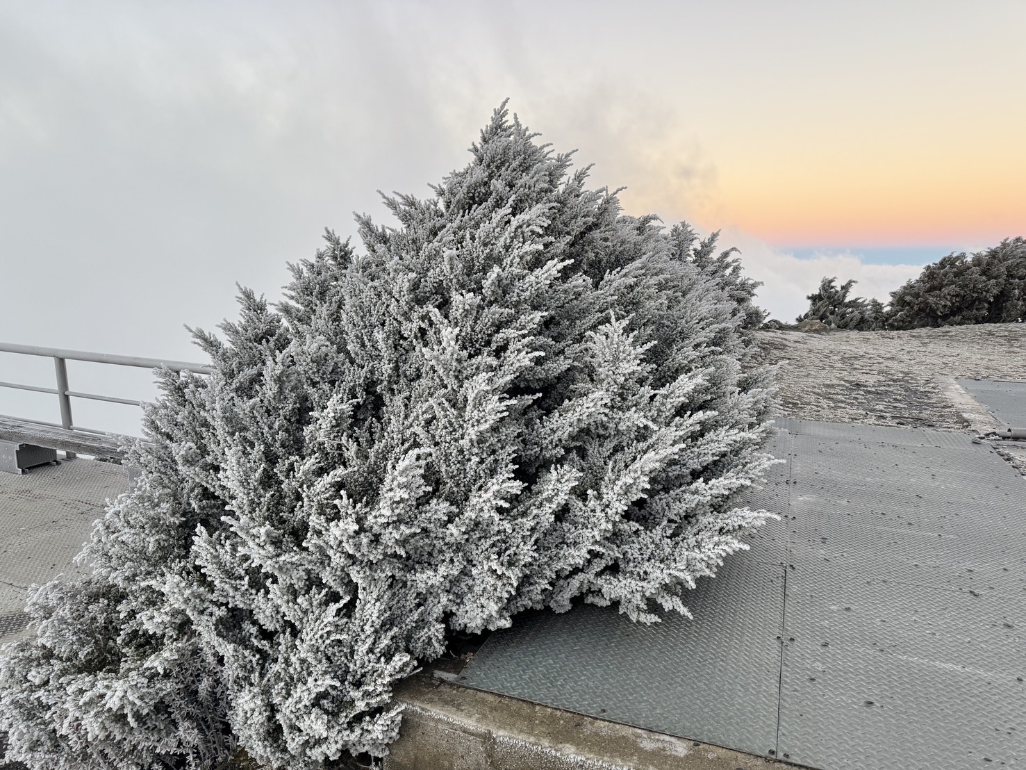 另外,合歡山今日凌晨4點多也達到降雪條件,武嶺氣溫降至零下3度,短暫降下霰夾雪,隨後在5點多雨霧中又飄起零星冰霰。