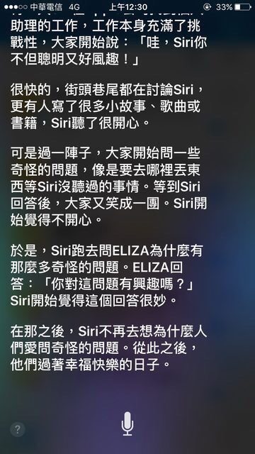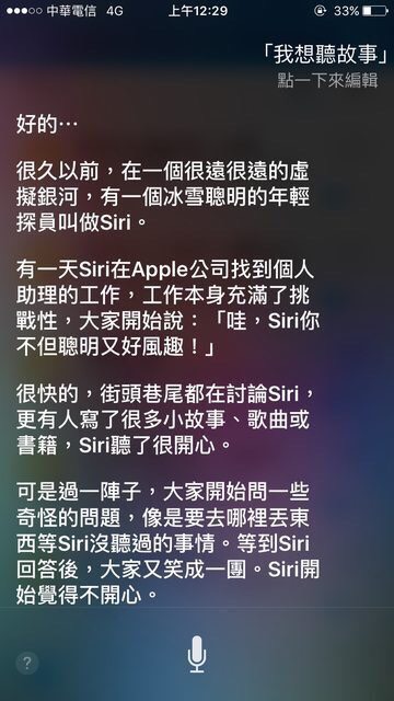 Siri」人工智能軟體,是許多人生活上得力的小助手,只要用聲音搖控,就能夠傳送訊息、播打電話、設定提醒事項以及進行多種作業等,不過日前就有一名網友突發奇想,突然很想聽故事,於是就呼喚Siri講故事給他聽,結果Siri真的很認真的講了一篇很長的故事給網友聽,與Siri之間的有趣對話讓笑翻大批網友。