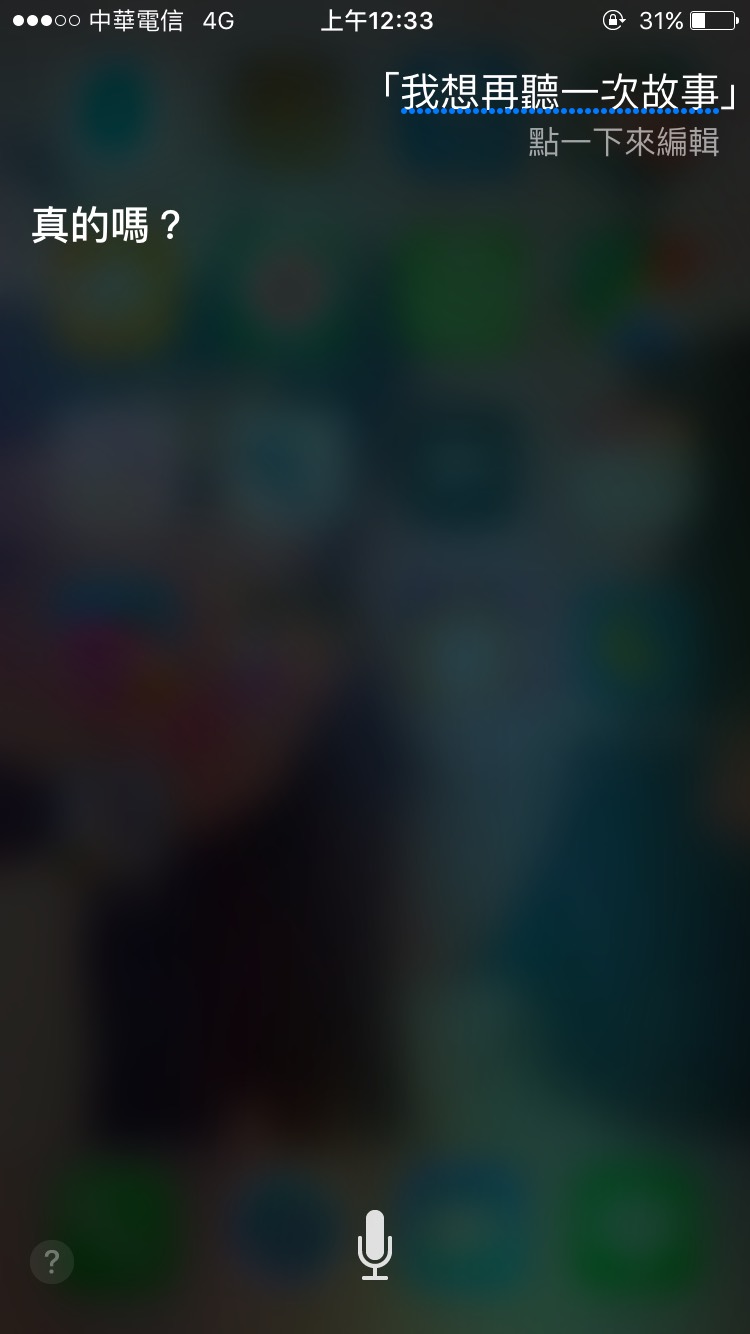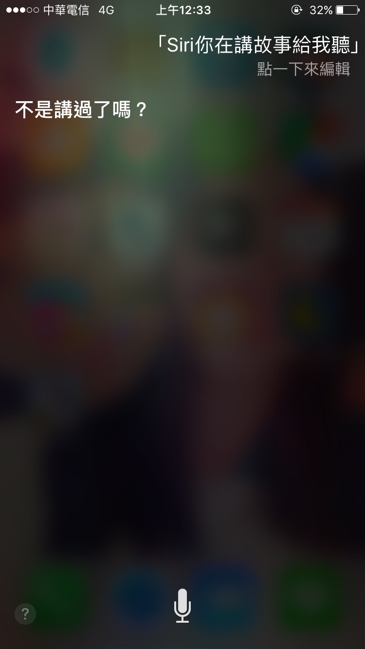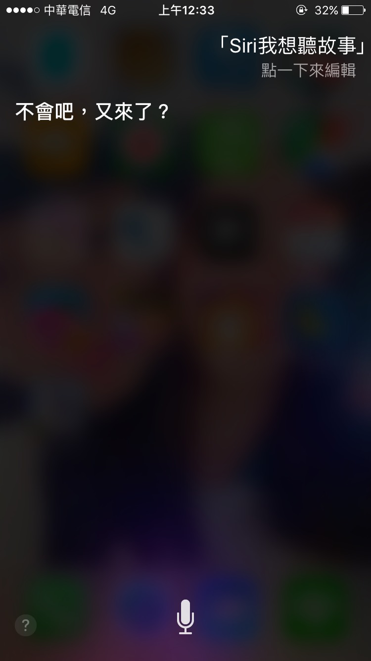 原po一天突然臨時起意,無聊想要鬧一下Siri,跟Siri說想要聽故事,萬萬沒想到Siri真的講故事給原po聽了,而且還超長一篇,原po很認真的聽完Siri講的故事,好奇心被激起,想知道還有沒有其它故事可以聽,於是就再度「盧」Siri說「我想聽故事」,可能Siri剛講完很長一篇故事,原po又要求,因此開始有點不耐煩了,敷衍回答「不會吧,又來了?」