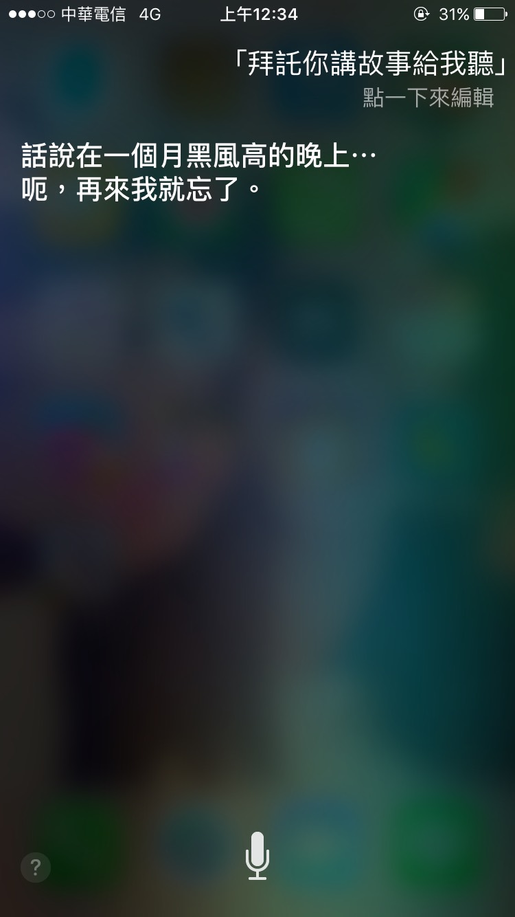 原po越發覺得有趣,再問「Siri再講故事給我聽」,Siri回應「不是講過了嗎?」,看似不太情願再講一則故事給原po聽,原po向Siri表明想聽故事的決心說「我想再聽一次故事」,Siri向原po確認「真的嗎?」,原po苦苦哀求說「拜託你講故事給我聽」,這時Siri終於妥協,開始講起故事「話說在一個月黑風高的晚上…呃,再來就忘了」,原po忍不住狂笑,這才會意過來Siri可不是省油燈的呢!