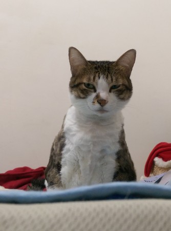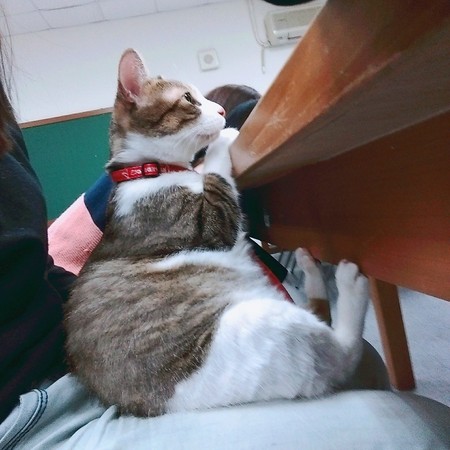 令人吃驚的是,班上的學生不是在滑手機,就是在打瞌睡,咪咪竟然是全班「最認真」的學生!從照片中可以看到,咪咪坐在主人大腿上,兩隻腳趴在桌緣,露出一顆小小的貓頭,兩個眼睛黑溜溜、圓滾滾,專注的凝視前方,非常認真聽講的樣子,讓人看了直呼都要融化了,而咪咪坐著露出的大屁屁,也成為另一個亮點!不過這種情形,也讓原PO忍不住表示「老師都不知道該哭還該笑」。