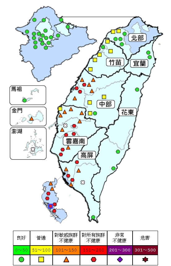 目前南投縣、雲林縣、嘉義縣,金門縣四縣的AQI呈現「橘色警戒」標準,對敏感族群健康有不良影響。而台中市、彰化縣、嘉義市、台南市、高雄市、屏東縣六縣市局部地區監測站AQI到達「紅色不良」標準,外出民眾除了配戴口罩外,也可以多喝水代謝體內有害物質。