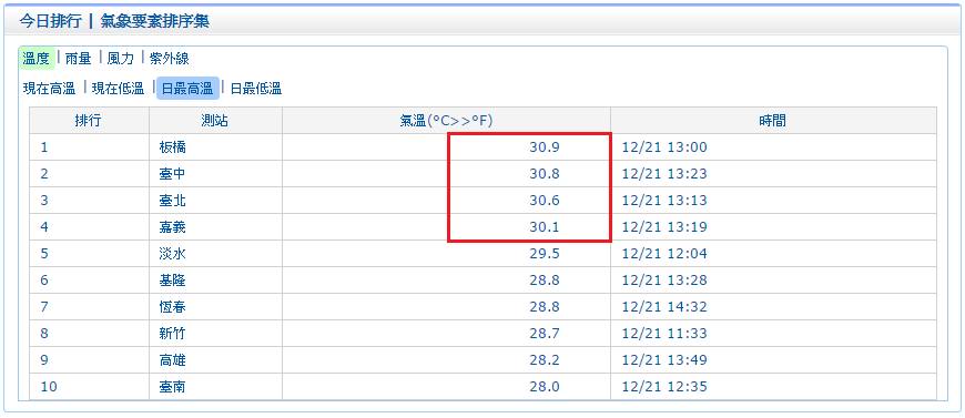 今年冬至氣溫再創新高!中央氣象局表示,今天(21日)白天鋒面接近,水氣及雲量逐漸增加,上午台灣地區及澎湖、金門為多雲到晴,各地高溫逼近30度,氣象局預報中心主任鄭明典也表示,今年是「沒有冬味的冬至」,台灣12月不常出現30度以上高溫,今天看到了!。