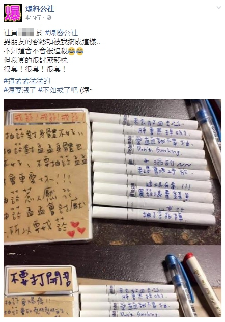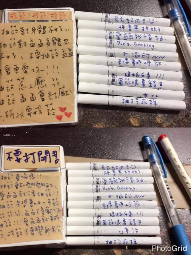 網友為了讓男友戒掉抽菸的習慣,她突然心血來潮拿出了男友的菸盒,把裡面的香菸一根根拿了出來,分別用原子筆在香菸上寫「老公放回去」、「肺會黑掉喲」、「老婆會吸二手菸」、「這根有毒」、「抽了會死掉」等等,菸盒上也被貼上了「戒菸!戒菸!戒菸!」的紙條,完全顯示出她想要男友戒菸的決心,卻又深怕這樣做會被男友追殺,因為她真的很討厭菸味,覺得「很臭!很臭!很臭!」