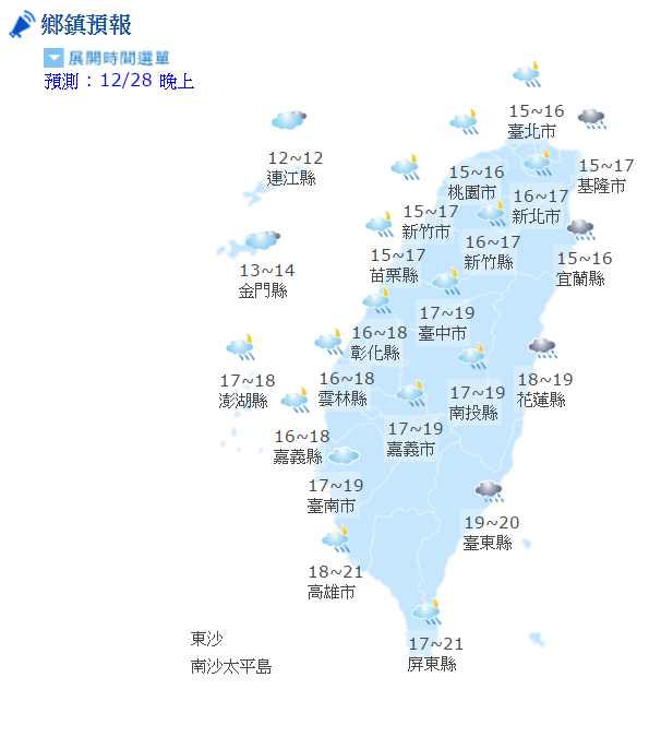 ▼下周三(28日)晚間溫度預測(圖/中央氣象局)