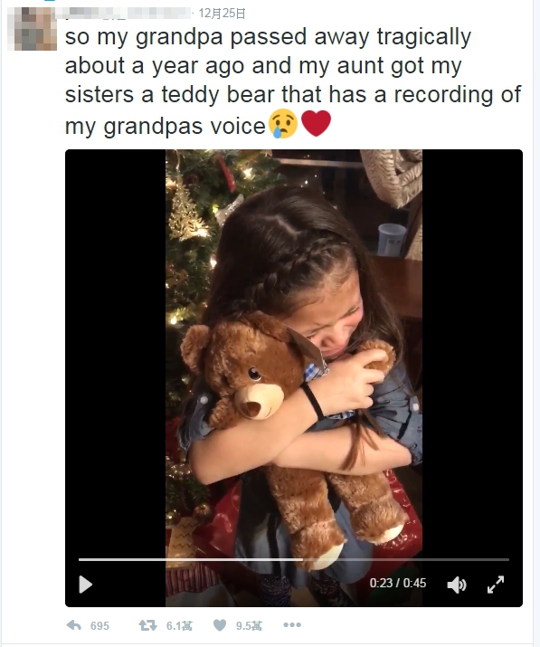 從影片中可以看到,穿著灰色衣服的妹妹馬里亞納(Mariana)收到禮物時開心尖叫,但此時的她並不知道有「玄機」,以為只是一般的泰迪熊而已,當家人鼓勵她按熊的手時,熟悉的聲音傳了出來,那是她思念一年爺爺的聲音,馬里亞納先是愣了一下,隨即雙手緊緊環抱玩偶,並且忍不住哭泣。而另一位妹妹莎拉(Sarahy)一臉疑惑地也按了熊的手,打開了神秘的機關,也聽到了爺爺的聲音,跟著哭成一團。