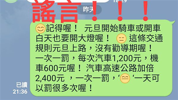 最近在通訊軟體LINE上瘋傳一則「認同請分享」訊息,其中寫道:「記得喔!元旦開始騎車或開車白天也要開大燈喔!這條交通規則元旦上路,沒有勸導期喔!一次一罰,每次
