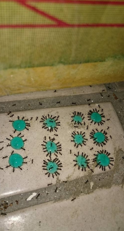 驅蟻劑」像辦桌一樣整齊排列,一桌有將近快20隻螞蟻乖乖「坐」好,盡情享受歲末尾牙,一旁還有其他姍姍來遲的螞蟻陸續加入,殊不知死亡正一步步逼近牠們。
