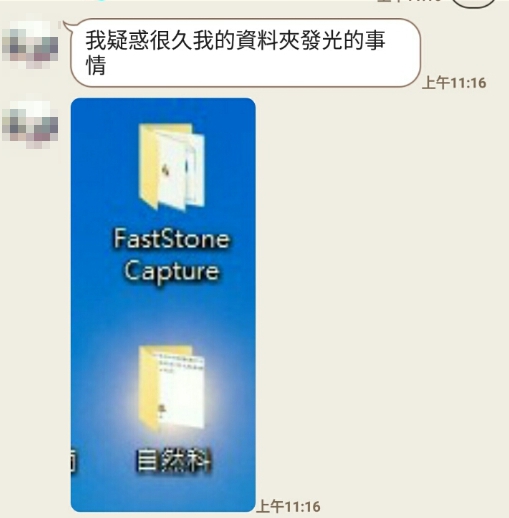 而這位同學日前終於找到答案,並且傳Line給原PO,表示自己知道為什麼自然科的資料夾會發光了,原來就是因為他的桌布上有一個小光點,位置剛好就在自然科資料夾的後方,所以才會讓資料夾散發出神奇光暈。原PO看到解答之後直呼「我同學實在是太笨了」。