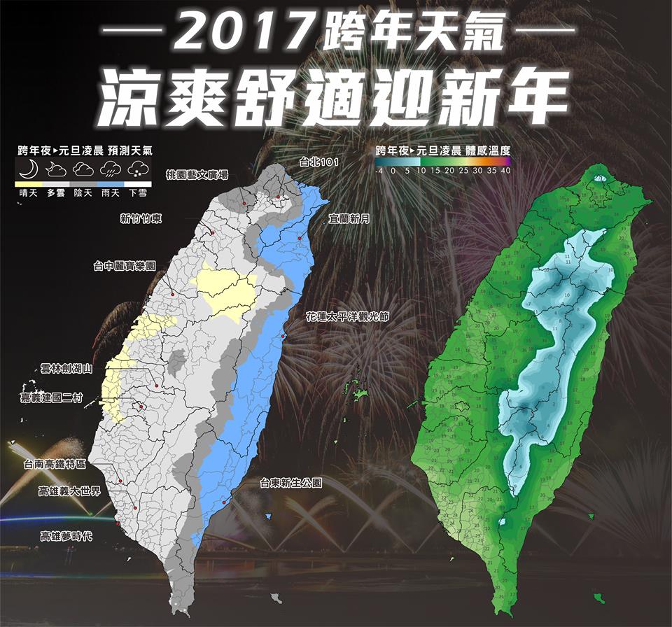 臉書粉絲團「台灣颱風論壇」也分別製作「跨年天氣」、「元旦天氣」兩張圖,並提醒大家: