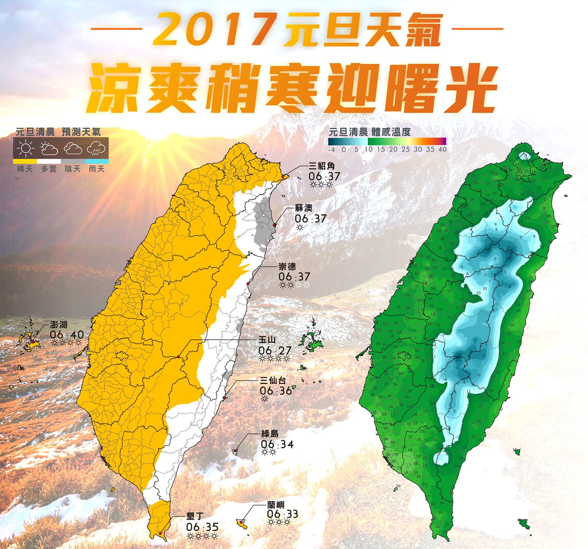 而在氣溫的的感受上仍偏涼,各地大多在19至21度附近,中部以北空曠地區會再略低一些,大約在18度左右。不過,進出人潮眾多的場合時體感溫度變化大,提醒大家適時調整穿著,到了元旦清晨氣溫則會再略降1至2度,東半部雲量仍偏多,要看曙光可能要碰碰運氣,西半部高山條件相對較好。