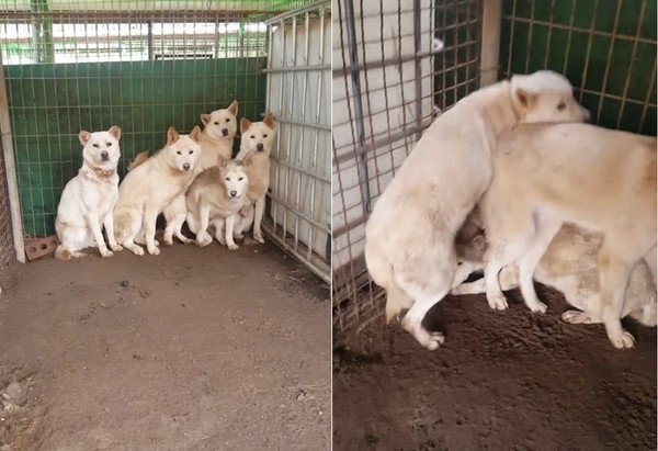 ▼剛被從繁殖場拯救出來的狗狗們,看到人類會警戒地靠在角落(圖/Nami Kim臉書)