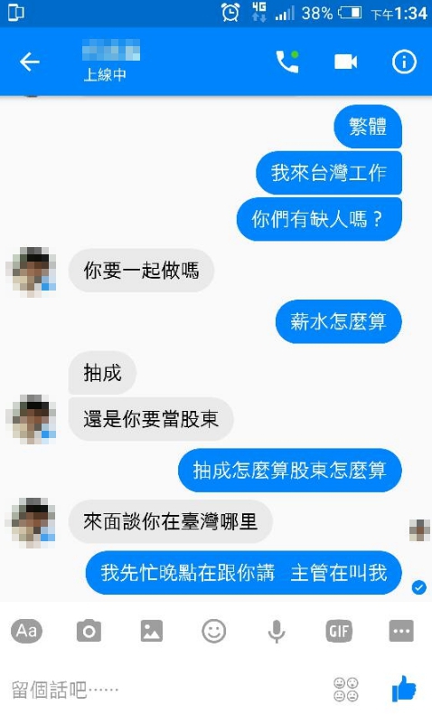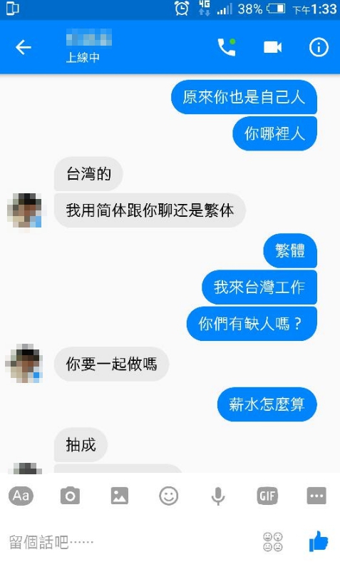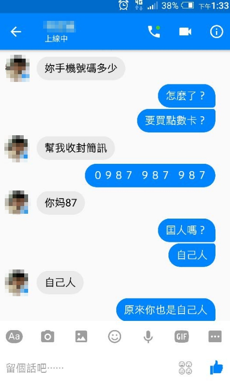 根據網友轉貼到臉書社團「爆料公社」的一組照片,對方開頭就問網友手機號碼是多少,要求幫忙收簡訊,網友回應「0987987987」,沒想到慘遭對方挨罵,所以馬上補了一句「國人嗎?自己人」,讓對方瞬間卸下防備,也立刻回應「自己人」,還透露自己是台灣人,問要不要一起工作,薪水是抽成計算。