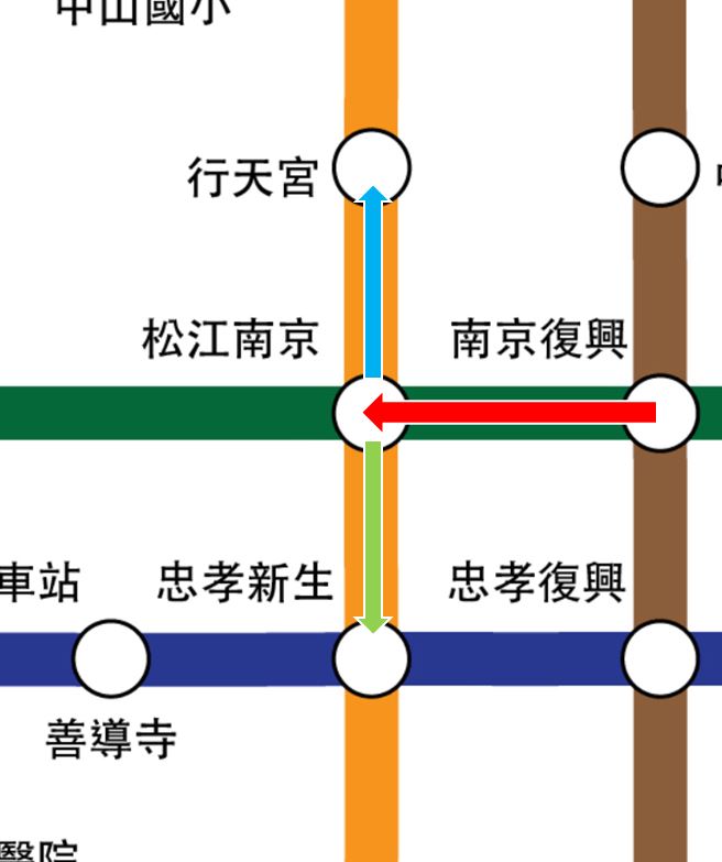 ▼紅色箭頭:原PO和學弟妹們從南京復興一起坐到松江南京。淺藍箭頭:學弟妹轉車路線。淺綠箭頭:原PO轉車路線。