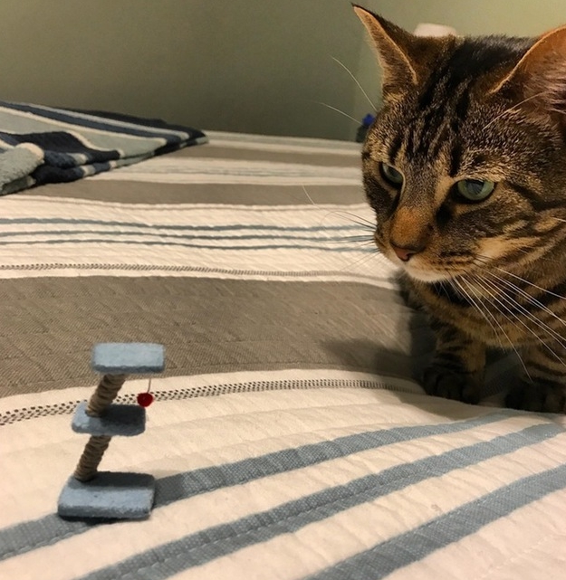 然而,當該名網友收到貨物後,不僅沒有喜悅的心情,有的只是傻住不知道該怎麼辦的想法,因為這個花了他20美元的跳台,總高度居然只有4.5公分高,連愛貓趴在床上,看著眼前這「超級迷你」的跳台,都愣在那裡,雙眼直盯著它,眼神中透露著「這啥鬼?」的疑惑感。
