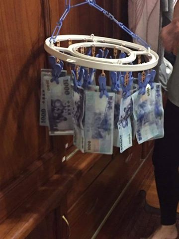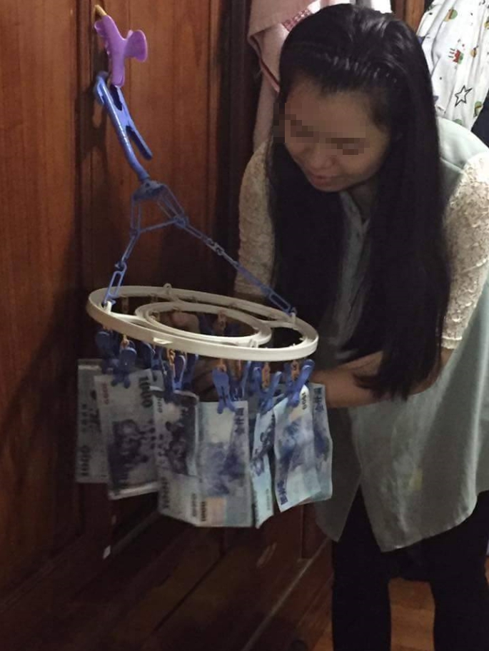 只見網友貼出的照片中,一張張千元大鈔全被夾在晾襪子的曬衣架上,站在後方的老婆還很有耐心地把鈔票攤開,等著這些私房錢晾乾之後「充公」,臉上都洋溢著得意的笑容。