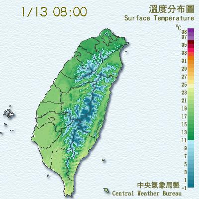 ▼1/13 8點 各地氣溫圖(圖/中央氣象局)