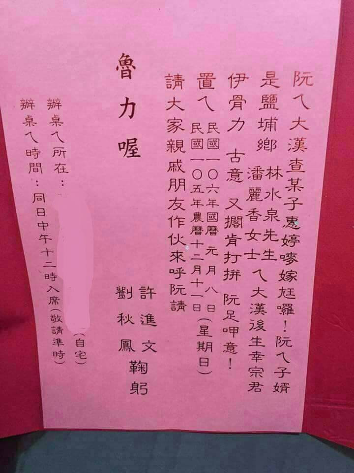 原來這張喜帖要唸出來,才能看懂其中的意思,因為喜帖上面全都是用台語翻譯而來的,「阮ㄟ大漢查某子XX嘜嫁尪囉(我的大女兒XX要嫁人囉)!阮ㄟ子婿是XX的大漢後生XX(我的女婿是XX的大兒子XX),伊骨力、古意、又擱肯打拚,阮足呷意!(他努力、老實,有願意認真打拼,我非常滿意他!),就連喜宴時間地點也不例外,「辦桌ㄟ所在、時間」,讓人看了不禁會心一笑。