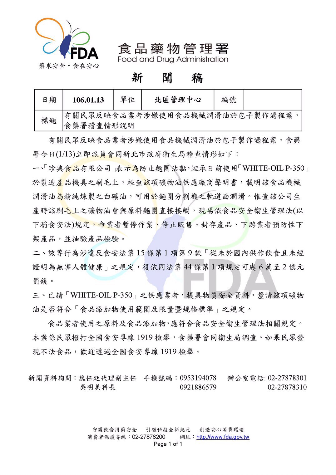 根據《自由時報》報導,衛生局食品藥物管理科長劉君豪說表示,衛生局接獲檢舉,昨天會同食藥署人員到場檢查,理論上該種食用級的機械潤滑油成本比沙拉油還高,業者沒必要如此做,但為求慎重,衛生局會查清楚,讓消費者安心。