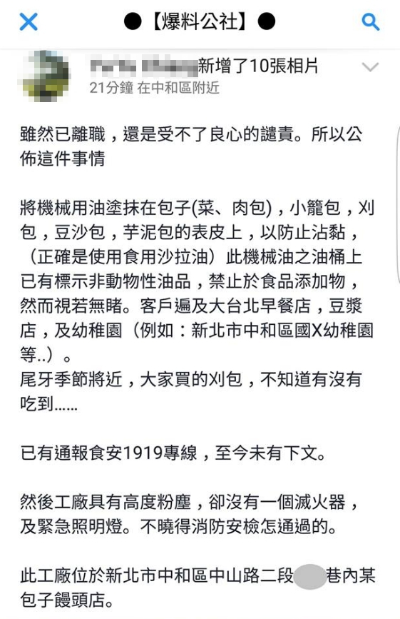 日前一名網友在臉書《爆料公社》發文,自稱是新北市中和一家包子店工廠的離職員工,指控店家用「機械用油」取代食用沙拉油,塗抹在各式包子的表皮上,以防止沾黏,完全無視油桶上標示「非動物性油品,禁止於食品添加物」,而且客戶遍及大台北早餐店、豆漿店及幼兒園!雖然網友表示已經有向食安專線1919通報,但至今卻未有下文。