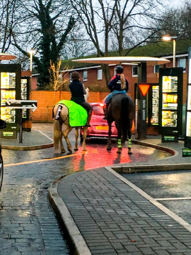 根據英國《鏡報》報導,英國一位媽媽萊爾(Emily Elizabeth Royle)在曼徹斯特的某家麥當勞得來速點餐,點餐後她慢慢向前開往取餐車道,拐了一個彎後她定睛往前瞧,居然發現兩名女騎師居然騎著馬兒在得來速車道取餐,而跟在馬兒後面的車小心翼翼地保持距離、深怕撞上,撞見這光景的萊爾立刻嘴角失守,爆笑無法停止。