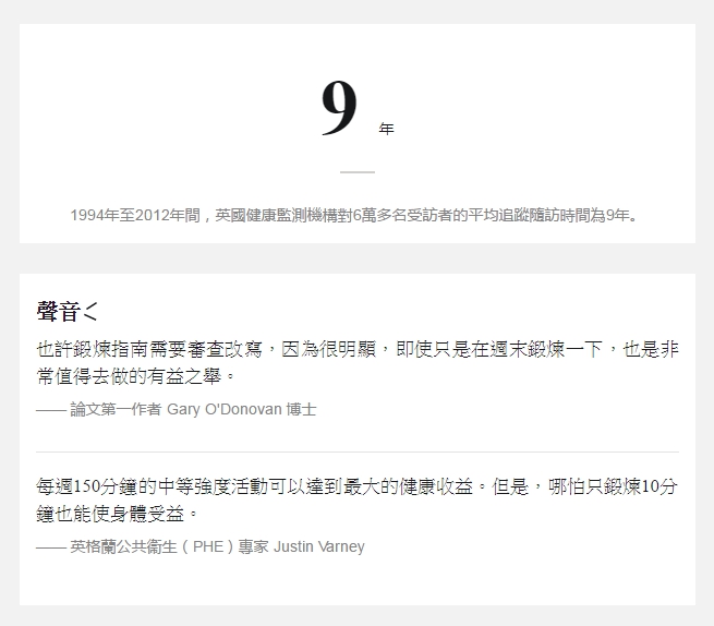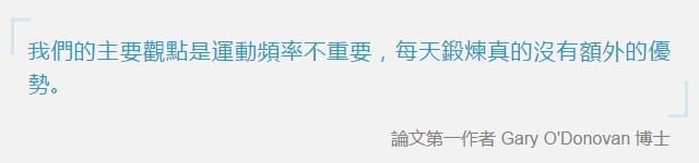英國 Loughborough大學運動醫學項目研究員 Gary O'Donovan 是論文的第一作者,他和團隊成員申請調閲了1994年至2012年間,英國政府以家庭為基礎的健康監測項目數據,匯總分析了6萬3591名來自英格蘭與蘇格蘭、40歲以上受訪者的健康調查問卷與死亡記錄,發現那些說他們每週只鍛煉一兩天的人與沒有鍛煉的人相比,過早死亡的風險降低了30%到34%;但更值得注意的是,那些在一週中鍛煉最多的人,其過早死亡的風險也僅降低了35%——與那些運動量少的人相差無幾。