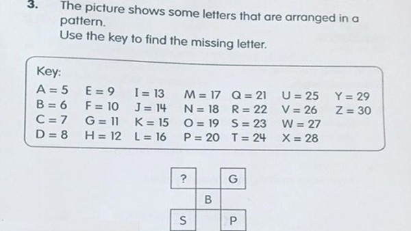 許多網友看到這段PO文後,紛紛表示想見識見識到底小一的數學有多難,不料看到題目後大家都傻眼了。照片中只見題目說明中指出,A到Z從A=5、B=6、C=7以此類推,排到最後一個字母Z=30。題目下方有五個方格,其中右上角是「G」、右下角是「P」、左下角是「S」、中間的方格是「B」,請計算左上角的方格應該填入哪個字母。