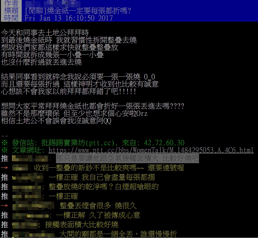 有網友在PTT上好奇發問,表示他和同事到土地公廟拜拜。拜完要燒金紙時,他習慣性將金紙包裝拆開後,整疊放進金爐中燒。網友提到他們家中因為求快,並不會折過金紙,而是直接一疊疊一起燒。不料同事看到他的舉動後,指責他必須一張一張折過後燒,這樣神明才收得到,也比較有誠意。這讓網友納悶了:「難道這麼久以來我家都燒錯了嗎?」