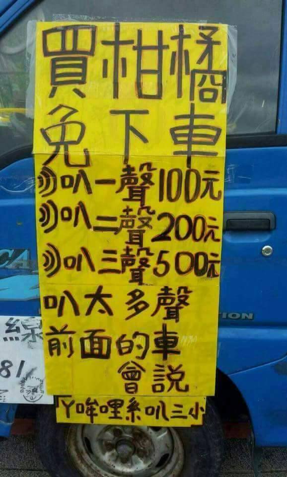 按喇叭,「叭」一聲就是買100元的柑橘,「叭叭」二聲就是買200元,「叭叭叭」三聲就是買500元,但若叭太多聲的話,老闆不但不會理你,還貼心地在看板上提醒說「叭太多聲,前面的車會說『ㄚ哞哩系叭三小』!」