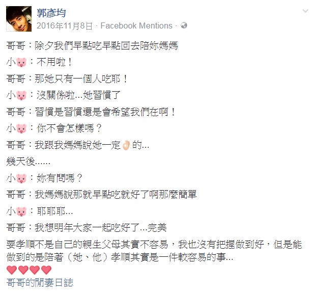 文末,郭彥均還有感而發的寫下「要孝順不是自己的親生父母其實不容易,我也沒有把握做到好,但是能做到的是陪著(她、他)孝順其實是一件較容易的事...」。郭彥均最近接受訪問時,也提到這件事,「有時候太太可能不方便講這些,但只要設身處地替對方著想,就能理解,也就更能去想出一個兩全其美的方法」。