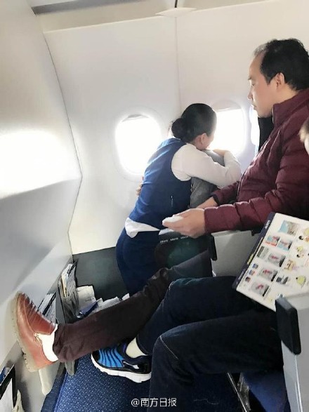 空姐為了安撫他的情緒,在下降的過程中都半跪在地雙手