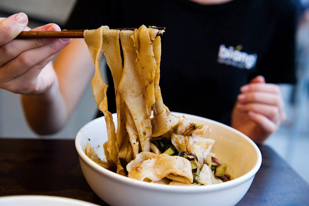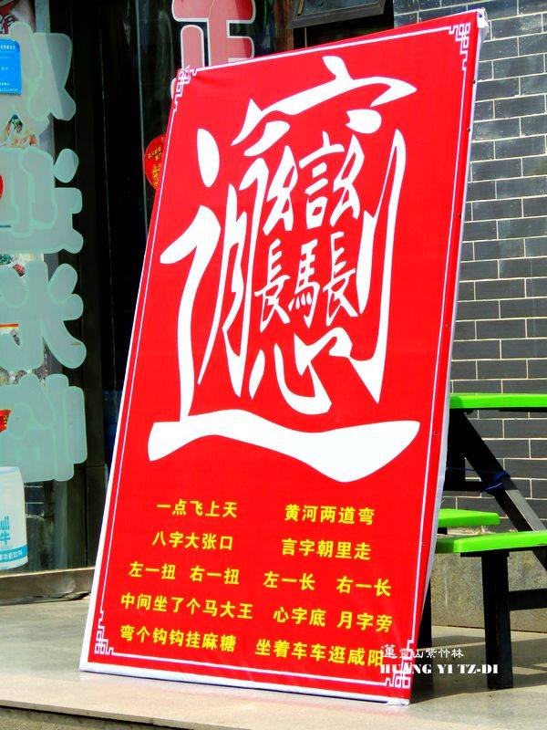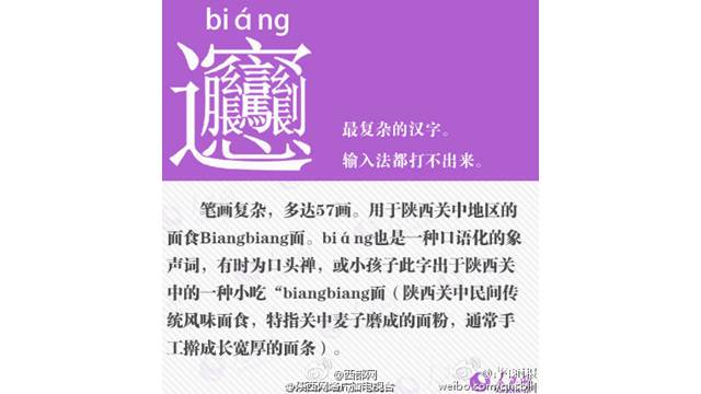 筆劃高達57劃,唸出來的發音接近「Biang」(ㄅㄧㄤˊ),被用於大陸陝西關中地區的一種道地美食「BiangBiang麵」,就是一種把麥子磨成的麵粉,在用手工擀成長、寬、厚的麵條所做出來的傳統麵食。