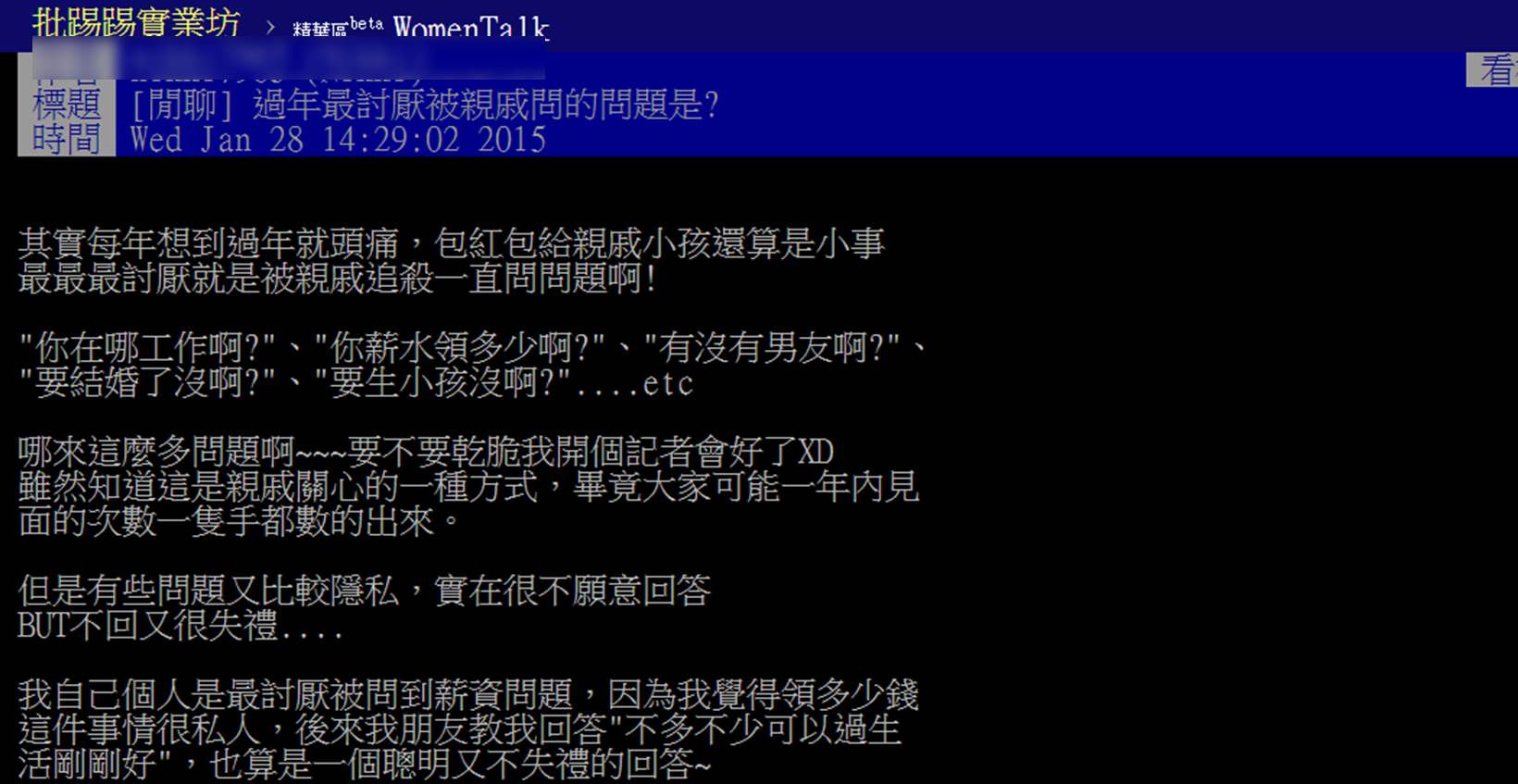 其中,大部分網友最不願聽到的第一種「關心話」就是「找到工作沒?薪水多少?」,網友說,每當氣氛歡熱的時候,長輩劈頭就問薪水,讓人覺得壓力很大。