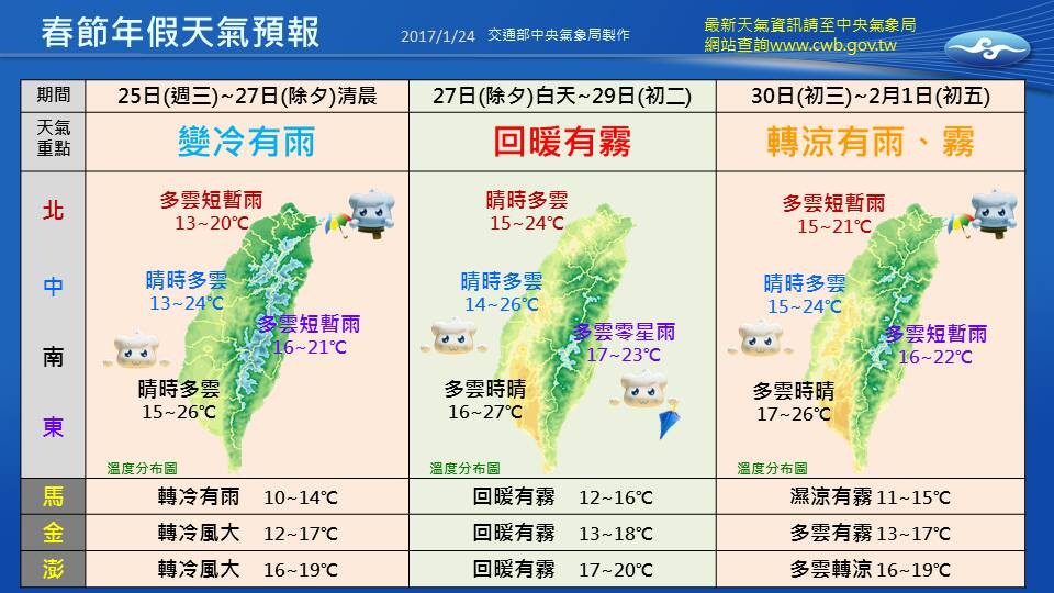 另外,氣象局表示春節期間,溫度最高會落在大年初二,北部高溫有24度,中南部甚至有27度。但是大年初三開始,受到東北季風的影響,天氣又要轉涼,還會有局部降雨狀況。