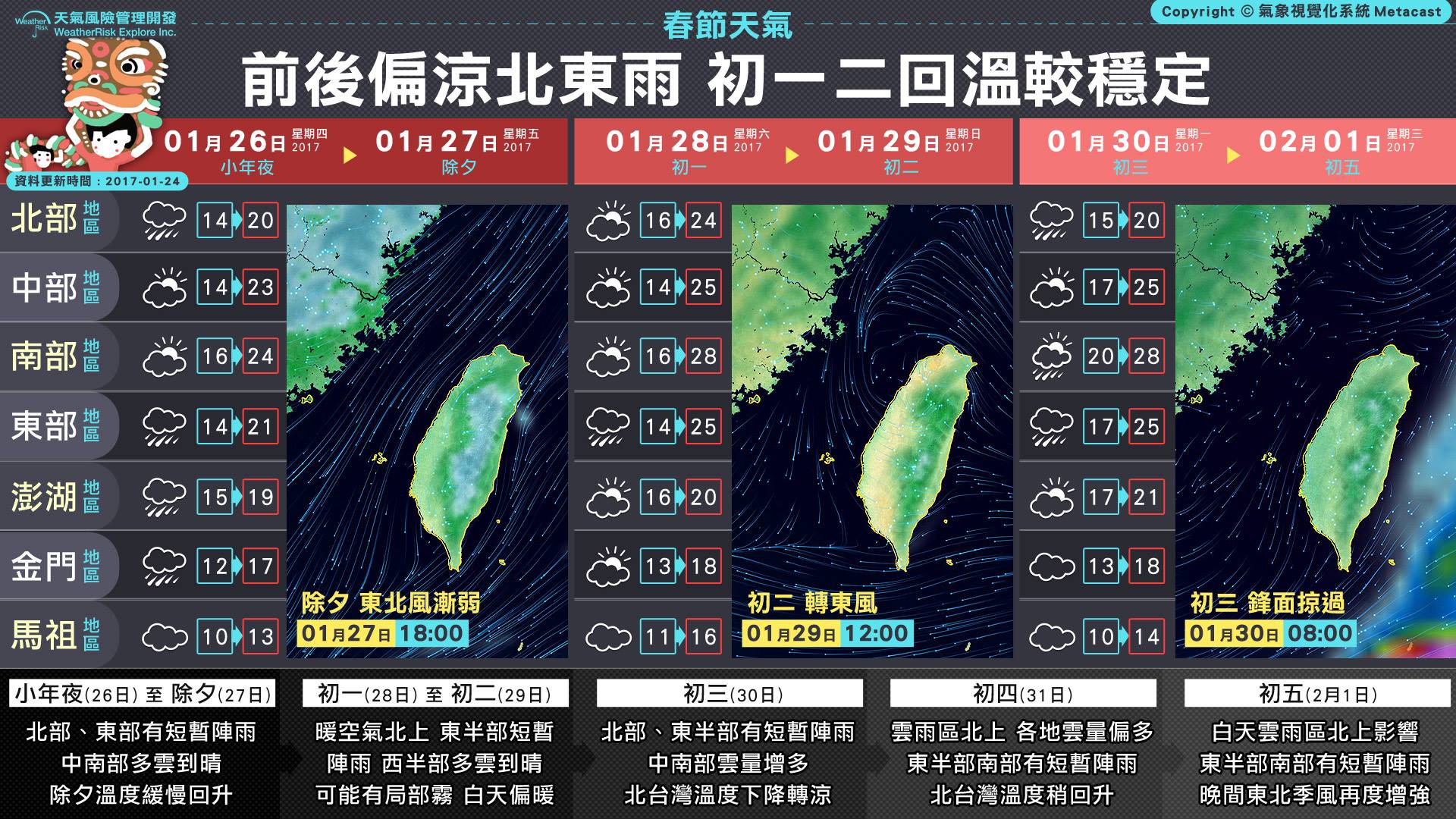 而「WeatherRisk 天氣風險」也在臉書粉絲專頁PO出一張圖,讓大家迅速了解過年天氣,從圖中可以清楚知道,今年的天氣屬於「前後偏涼」的狀態,天氣風險指出,初二前各地大都為多雲到晴,但是從初三開始,北部、東半部轉為有雨的狀態,且溫度也會下降。