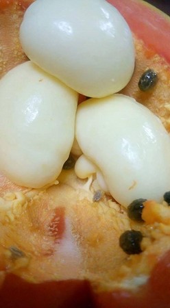 水煮蛋,但這3大顆像雞南佛的白色物體,其實是罕見的「胎木瓜」!農業專家表示,「裡面白色的小木瓜」應屬胚胎中的胚胎,就像是連體嬰般,不過全部的木瓜生木瓜,倒是相當罕見,很可能是木瓜主實體花粉受粉時,細胞分裂造成變異的不正常現象。