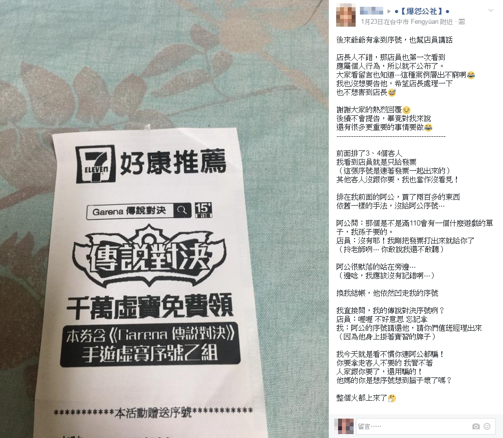 這一切都看在女網友眼裡,心中的怒火正熊熊燃燒著,換她結帳時,實習店員又故技重施,但這回他惹錯人了,女網友直接問「我的傳說對決序號咧?」,對方可能知道眼前的人不好呼弄,馬上說「喔喔!不好意思忘記拿」,接著女網友霸氣地說「阿公的序號請還他,請你們值班經理出來」,好在有女網友的挺身而出,後來阿公順利拿到要給孫子的序號,而且阿公也有幫該名店員講話,再加上店長人也不錯,因此這件事就此畫下句點。