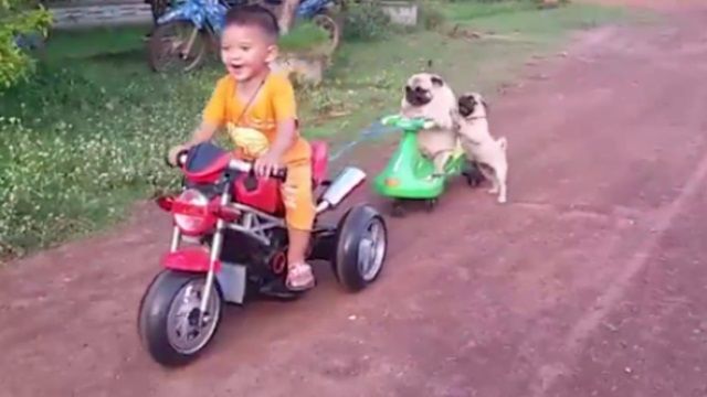畫面中小主人騎著一台帥氣的玩具車,後頭載著一大一小的巴哥,沒想到才剛出發,小巴哥疑似被前面體型壯碩的巴哥,硬生生擠了下車,小主人沒發現,結果小巴哥…