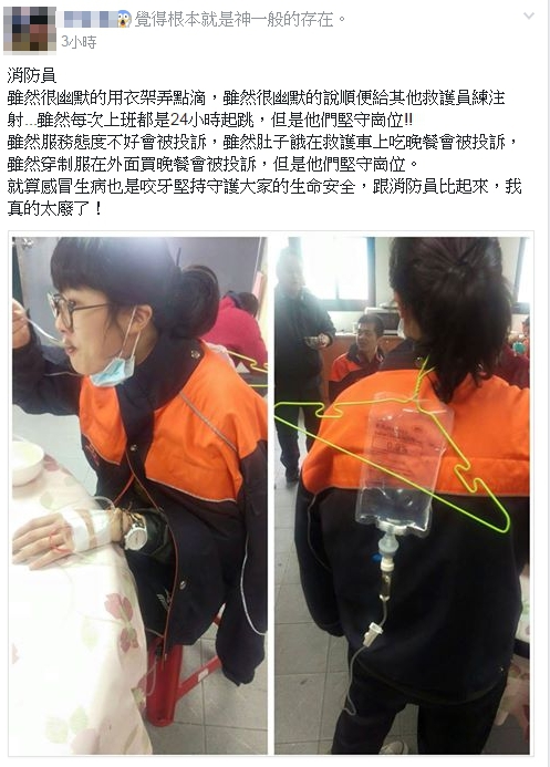 昨(31)晚雙園分隊王姓小隊長在臉書上指出,「我們家可憐小學妹生病了,但班還是要繼續上,讓同仁練了一針之後,就自製人肉點滴架,走到哪滴到哪,還真方便」,隨即引發眾人關注,只見照片中的女消防員左手背上上打著點滴,帶著口罩,還用衣架當成點滴架掛在外套上,看起來似乎有些辛酸。