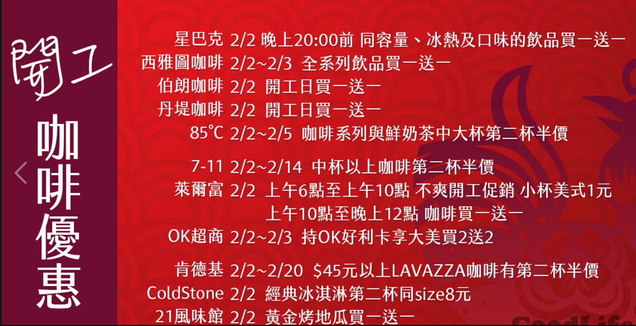 今年農曆年讓員工放假2小時吃年夜飯的萊爾富,今天開工日也推出優惠,分別為: