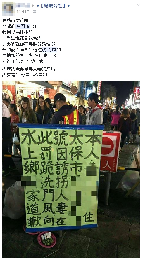 嘉義縣一名黃姓男子,大年初四在人潮眾多的嘉義市文化路夜市下跪,一旁還有黃色紙板寫上「本人XXX住太保市XX號,因誘拐人妻在此罰跪洗門風,向水上鄉X家道歉」,照片一傳上臉書,立刻就引起網友們議論紛紛,並且迅速造成瘋傳。