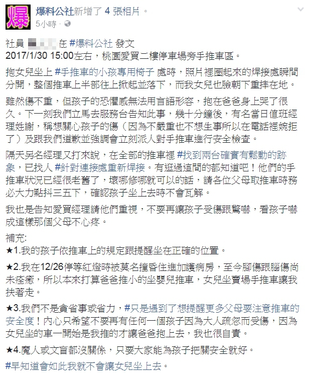 這對夫妻在臉書《爆料公社》表示,雖然女兒當時離地面不算高,所受到的傷勢不嚴重,唯身體有多處紅腫,「但孩子的恐懼感無法用言語形容,抱在爸爸身上哭了很久」。賣場經理得知之後,表示在全部的推車裡「找到兩台確實有鬆動的跡象,已找人針對連接處重新焊接」。