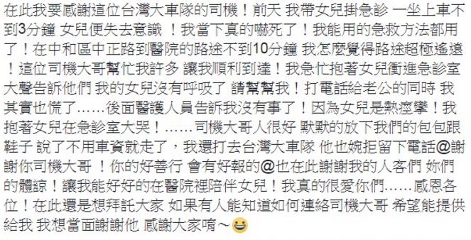 事後這位媽媽打電話去計程車隊,想要連絡上這名好心司機,不過司機低調地婉拒留下電話,於是她在臉書《我是中和人》發文,希望有人能幫忙連絡司機大哥,讓她能夠向司機當面致謝。