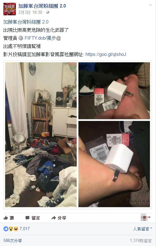 臉書「加藤軍台灣粉絲團 2.0」將照片PO出後,不少網友一看到插頭插得這麼深,忍不住KUSO苦主「對不起可以請問一下……這樣可以充電嗎?」、「比踩健康步道還要猛」,也有網友感受到這多麼痛的領悟,「我都握拳了,好痛」、「決定立馬整理房間!」。不過也有網友疑惑的覺得「假的啦,一點流血都沒有」、「這還有心情拍照」。
