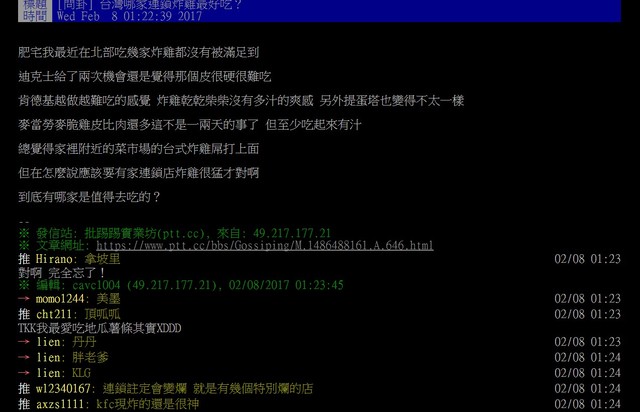 原PO感嘆寫道,近來試了幾家連鎖速食店都不是很滿意,像是吃了迪克士兩次,還是認為那個皮很硬很難吃;肯德基也有越來越難吃的感覺;而麥當勞的麥脆雞雖然皮比肉多,但吃起來有汁;不過覺得家裡附近菜市場的台式炸雞都比這些店好吃,不禁好奇問說:「到底有哪家連鎖店是值得去吃的?」。